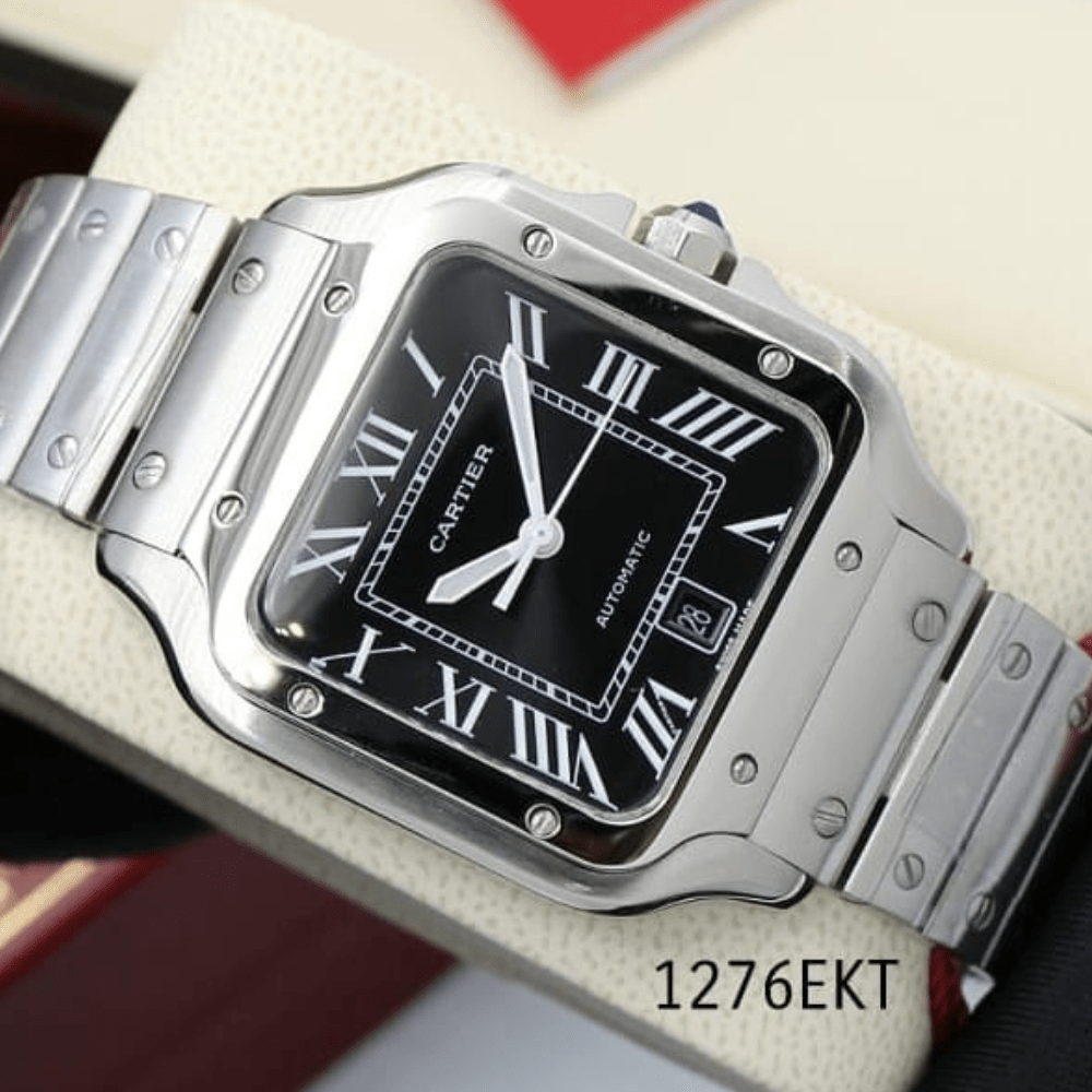 Experience luxury with Cartier Santos Men’s Watch. Crafted in stainless steel, featuring a 47mm black Roman dial. Timeless elegance redefined.