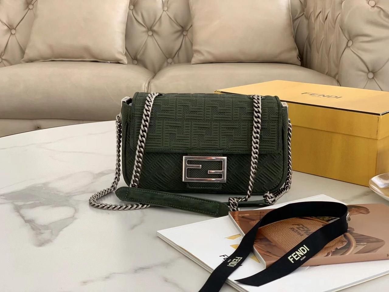 Chain shoulder strap 3D texture FF motif Decorated with an FF clasp Featuring a front flap, magnetic clasp, lined internal compartment with zip pocket. Can be carried by hand or over the shoulder thanks to the sliding-chain shoulder strap. Height: 14.5 cm Depth: 7 cm Length: 24 cm